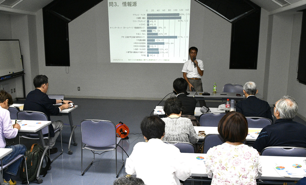 〝核のゴミ〟文献調査に関する寿都町民アンケートを実施した研究者グループが開いた報告会。全戸対象に調査したが、回収率は15%ほど。核ゴミ問題の是非に触れたくない、あるいは無関心という層が結構いることが浮き彫りに──。それでもNUMOや現町政に対する疑問の声は、賛否を超えて多かった(9月13日夜、寿都町内で)