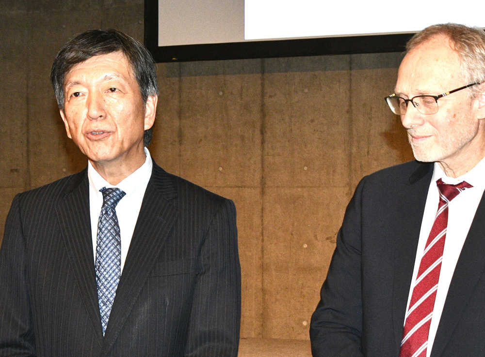 「処分技術シンポ」終了後、報道関係者のぶら下がり取材に応じるNUMOの山口彰理事長(左)