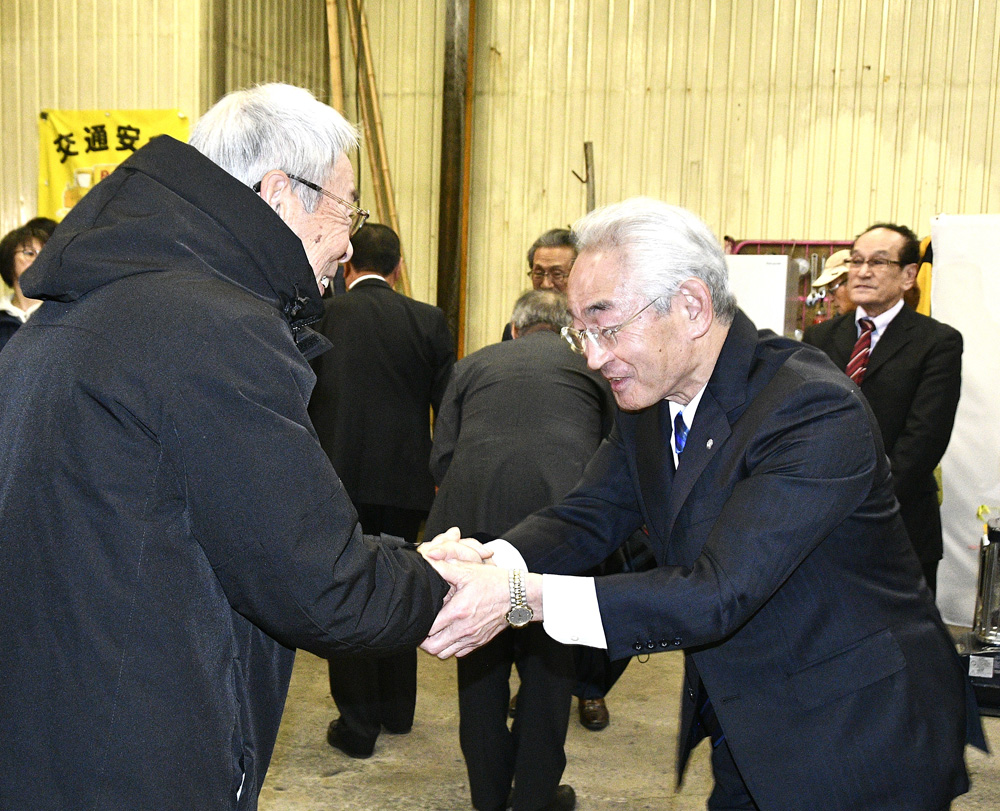 NUMOの施設の隣に設けた選対事務所で支援者と握手する片岡春雄氏