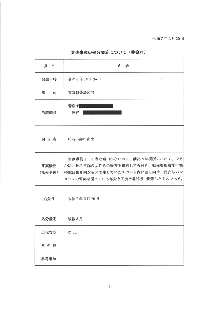 一般の国民ならば報道発表されてもおかしくない盗撮疑い事件などが、ことごとく公表を免がれていた(警察庁が開示した『非違事案の処分実施について』)