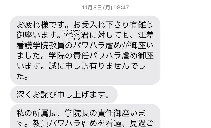 学院トップは早い時期にハラスメントの事実を認め、謝罪していた(事件後の2021年11月に元学院長が遺族へ送信したショートメールの文面)※ 画像の一部加工は本誌