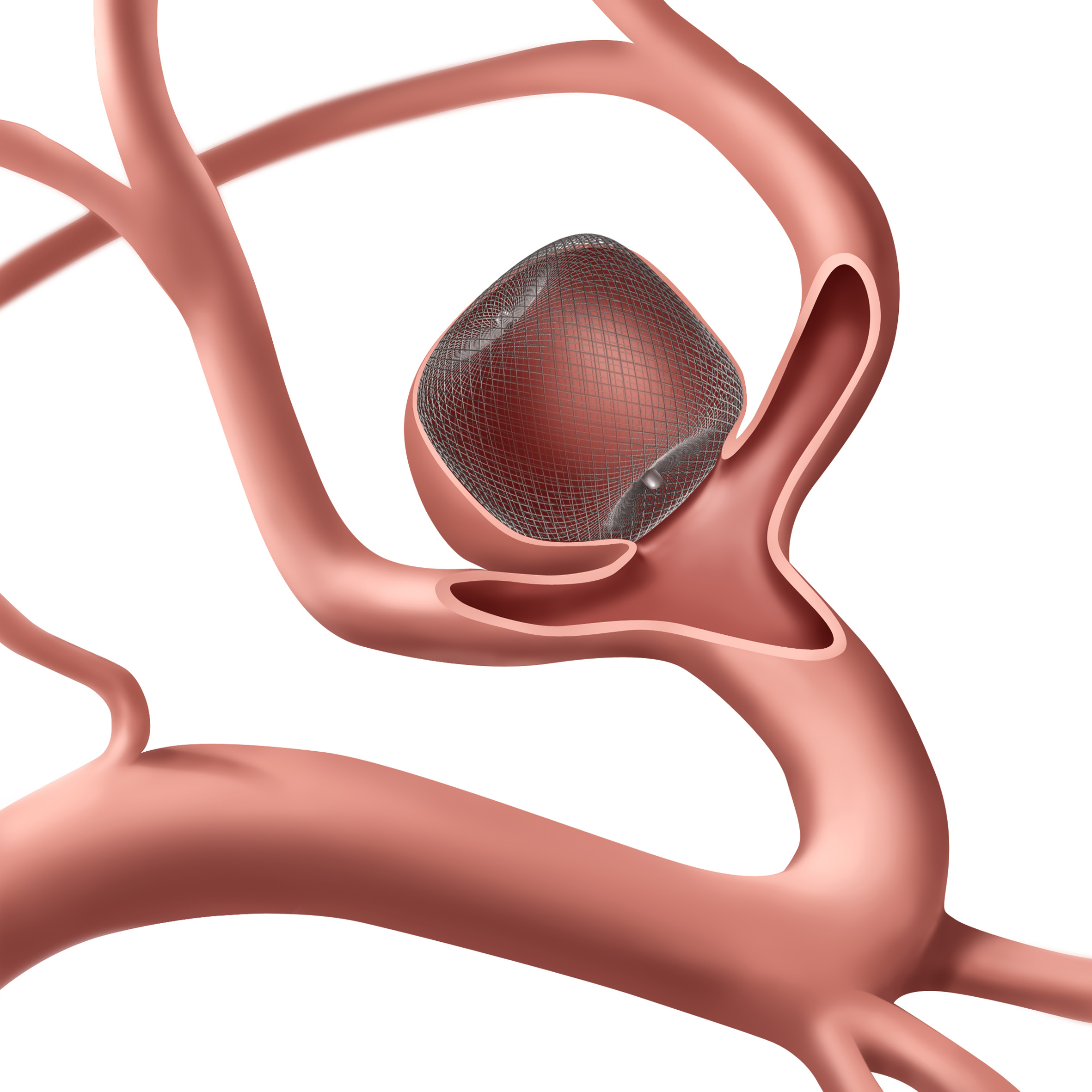 このほか動脈瘤の種類によっては、瘤のネック(入り口)を覆うように「フローダイバーター」というメッシュでできた筒状のステントを留置する方法もある。