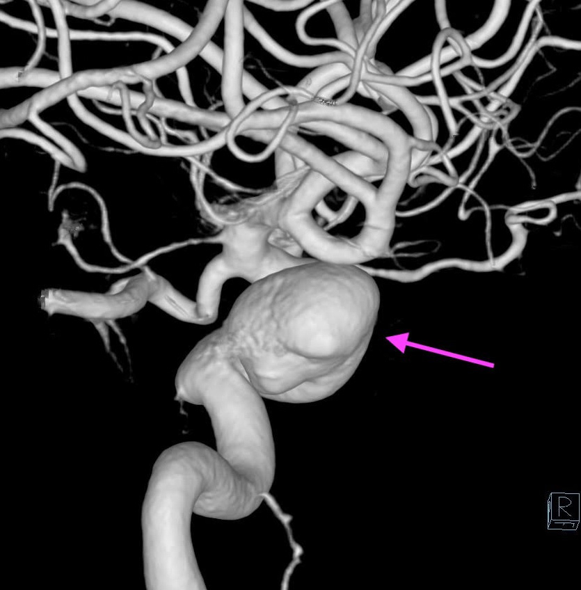 内頚動脈に大型動脈瘤を認める(矢印)