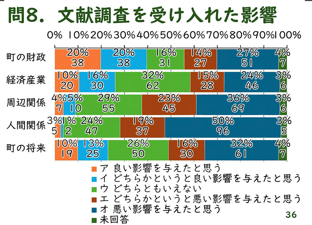 文献調査を受け入れた影響については「周辺関係や人間関係に悪い影響があった」との回答が6割前後を占めた(同)