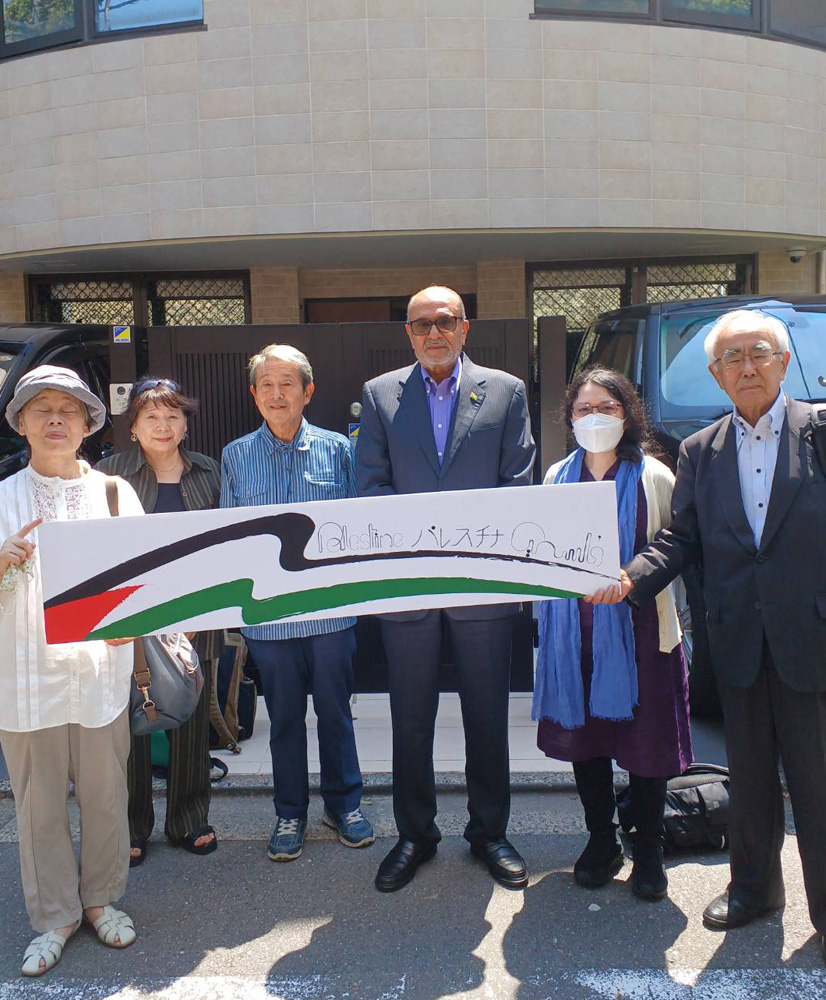 駐日パレスチナ常駐総代表部前でシアム大使と