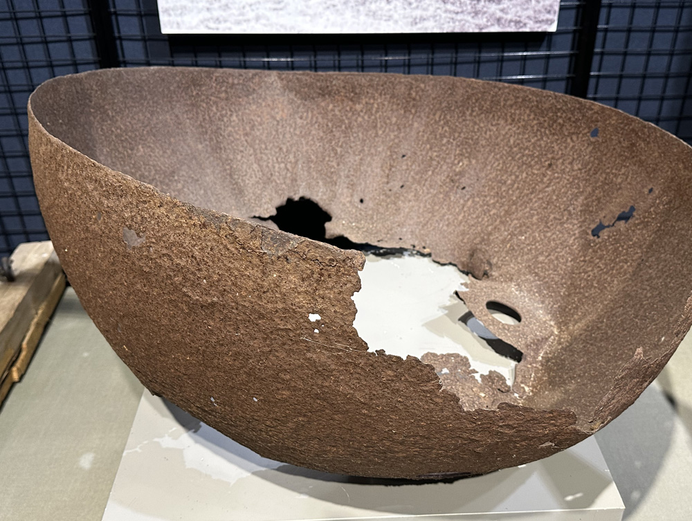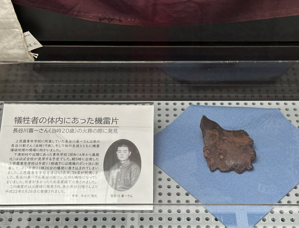 犠牲者の親族から提供された機雷の破片(火葬の際に見つかったもの)と説明文