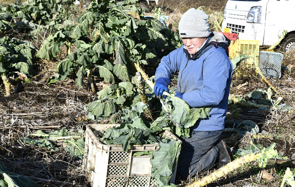本格的な降雪期を前に大型トラクターで緑肥作物を鋤き込む作業の手を休める「はるか農園」代表の三浦賢悟さん