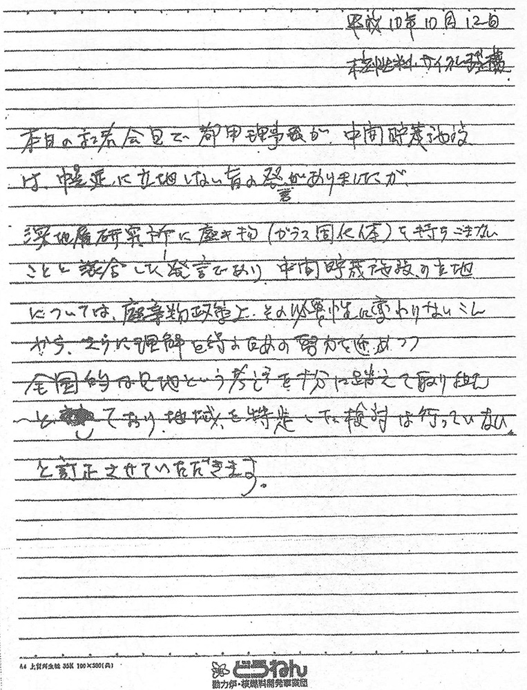 堀達也知事に対する立地要請の直後、核燃機構が示した「訂正文」(98年10月)