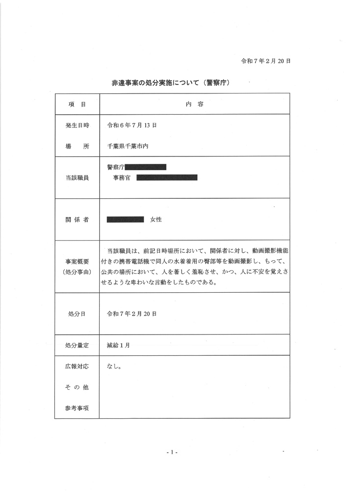 一般の国民ならば報道発表されてもおかしくない盗撮疑い事件などが、ことごとく公表を免がれていた(警察庁が開示した『非違事案の処分実施について』)