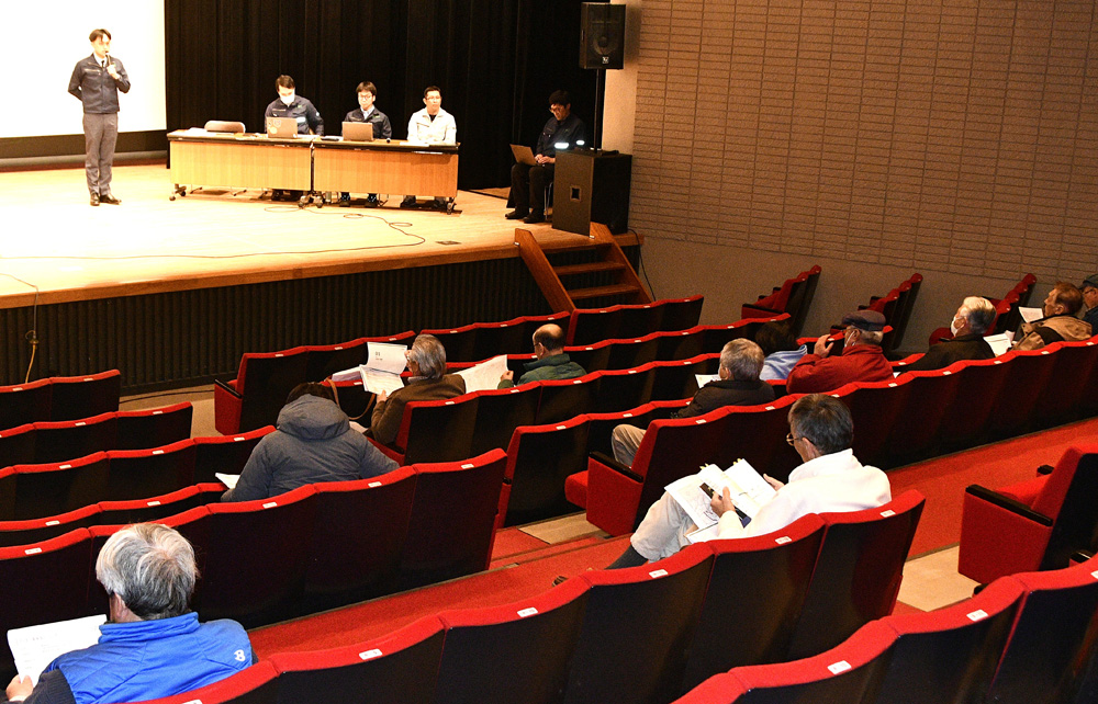 事業者の㈱グリーンパワーインベストメントが滝上町内で開催した説明会には、町民ら50人ほどが参加。建設にともなうリスクや自然環境に与える影響、地質の脆弱さなど多岐にわたる質問や意見が相次いだ(3月11日)